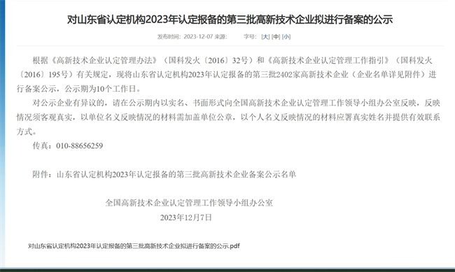 2023年12月7日,全国高新技术企业认定管理工作网发布了山东省认定机构2023年认定报备的第三批高新技术企业备案名单,山东新智联数字化有限公司顺利通过山东省高新技术企业认定,成功迈入高新技术企业行列。