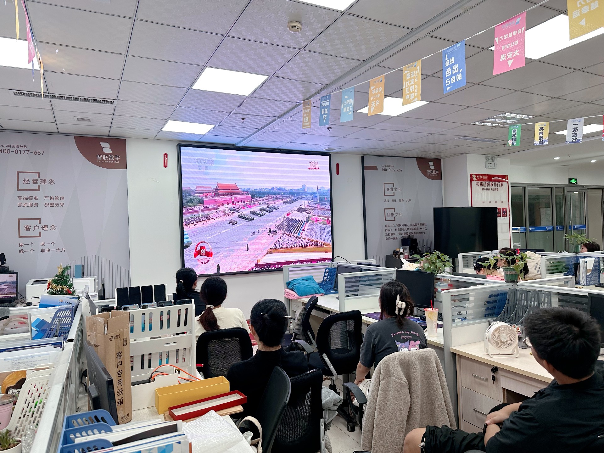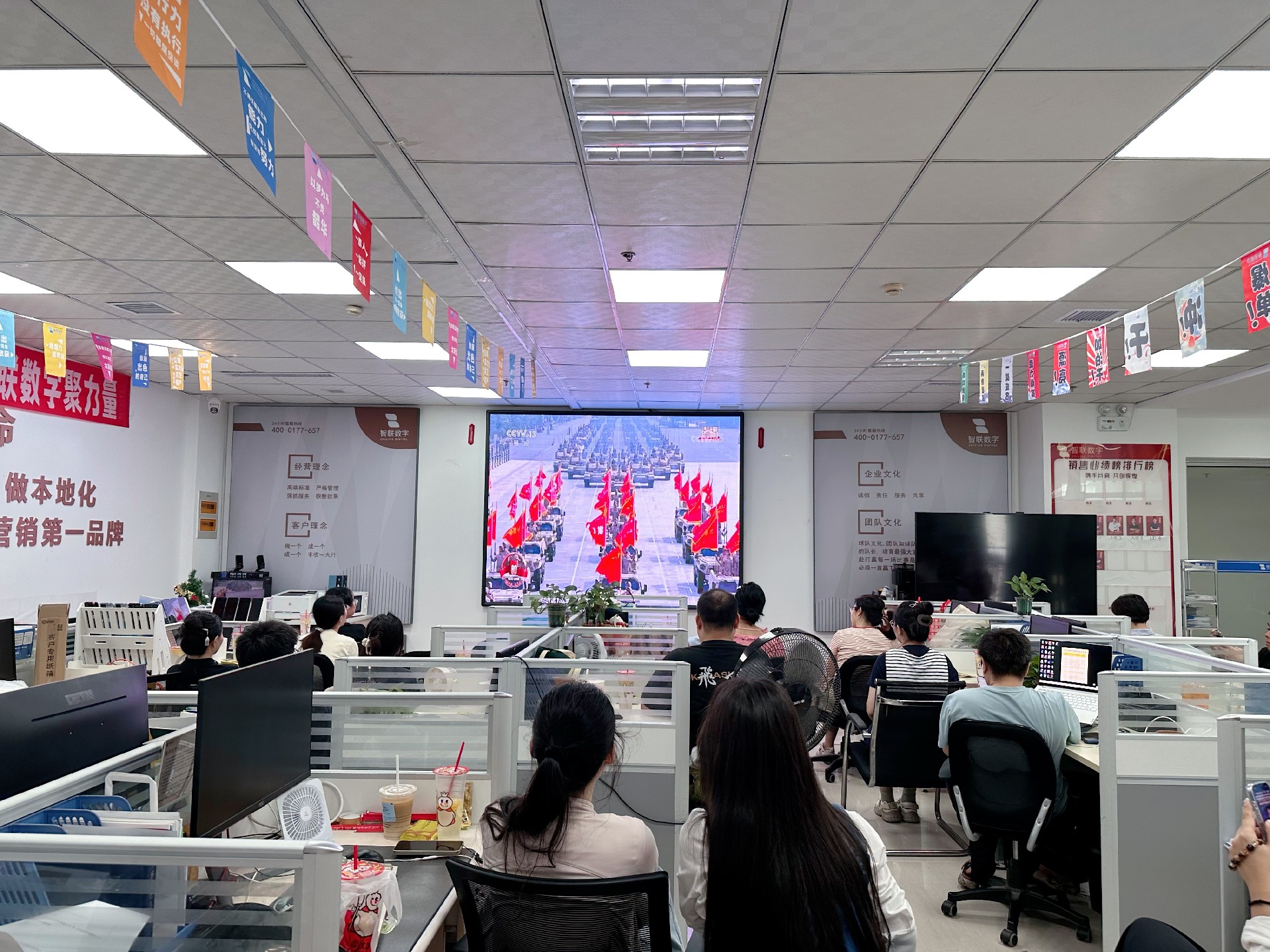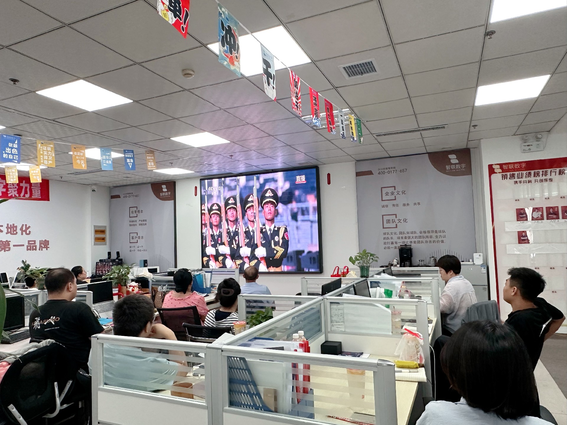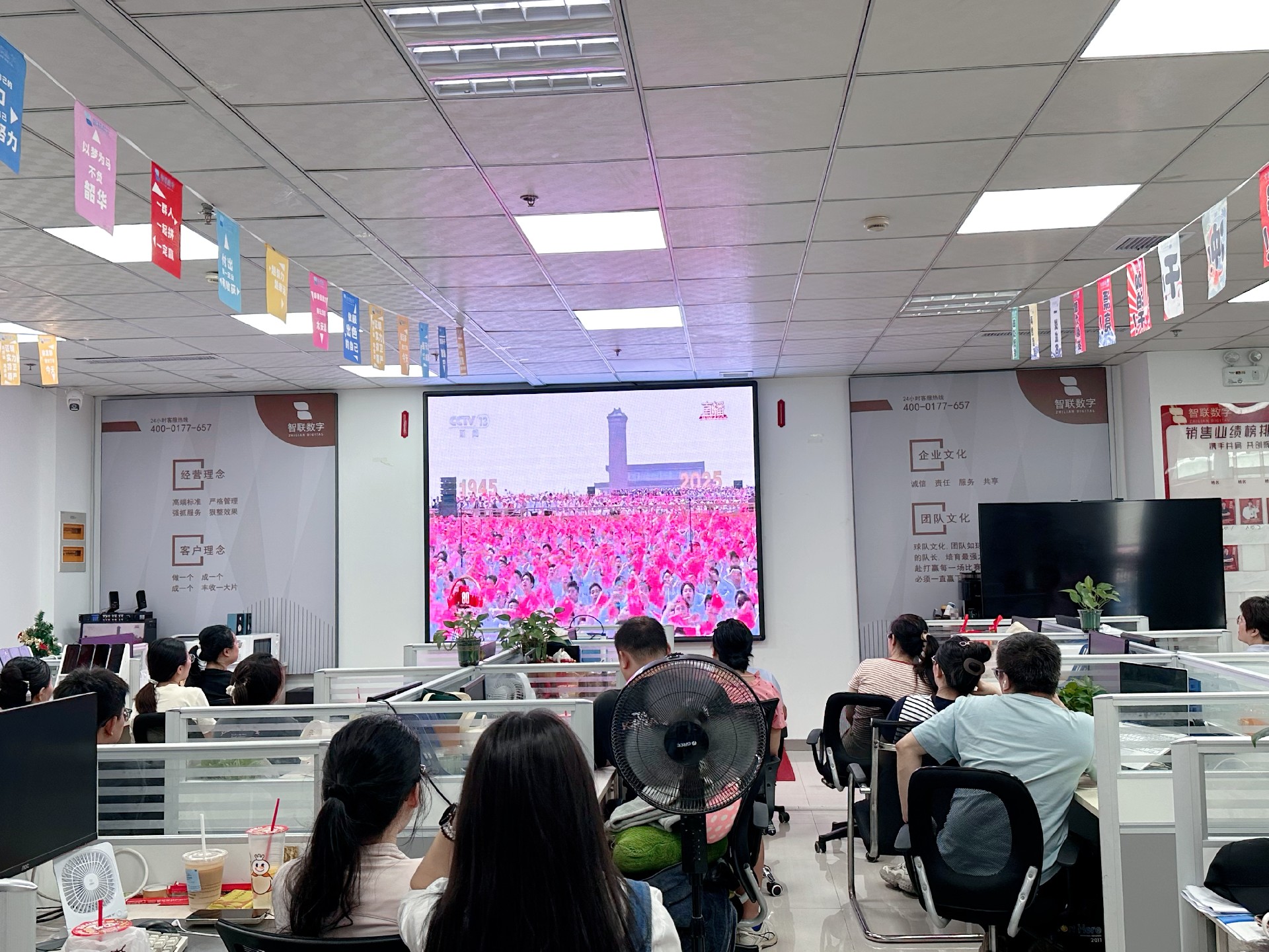 9月3日上午,纪念中国人民抗日战争暨 世界反法西斯战争胜利80周年活动在北京天安门广场隆重举行。智联数字统一安排组织全体员工集中观看实况直播,共同见证这一承载民族记忆、彰显大国担当的历史时刻。